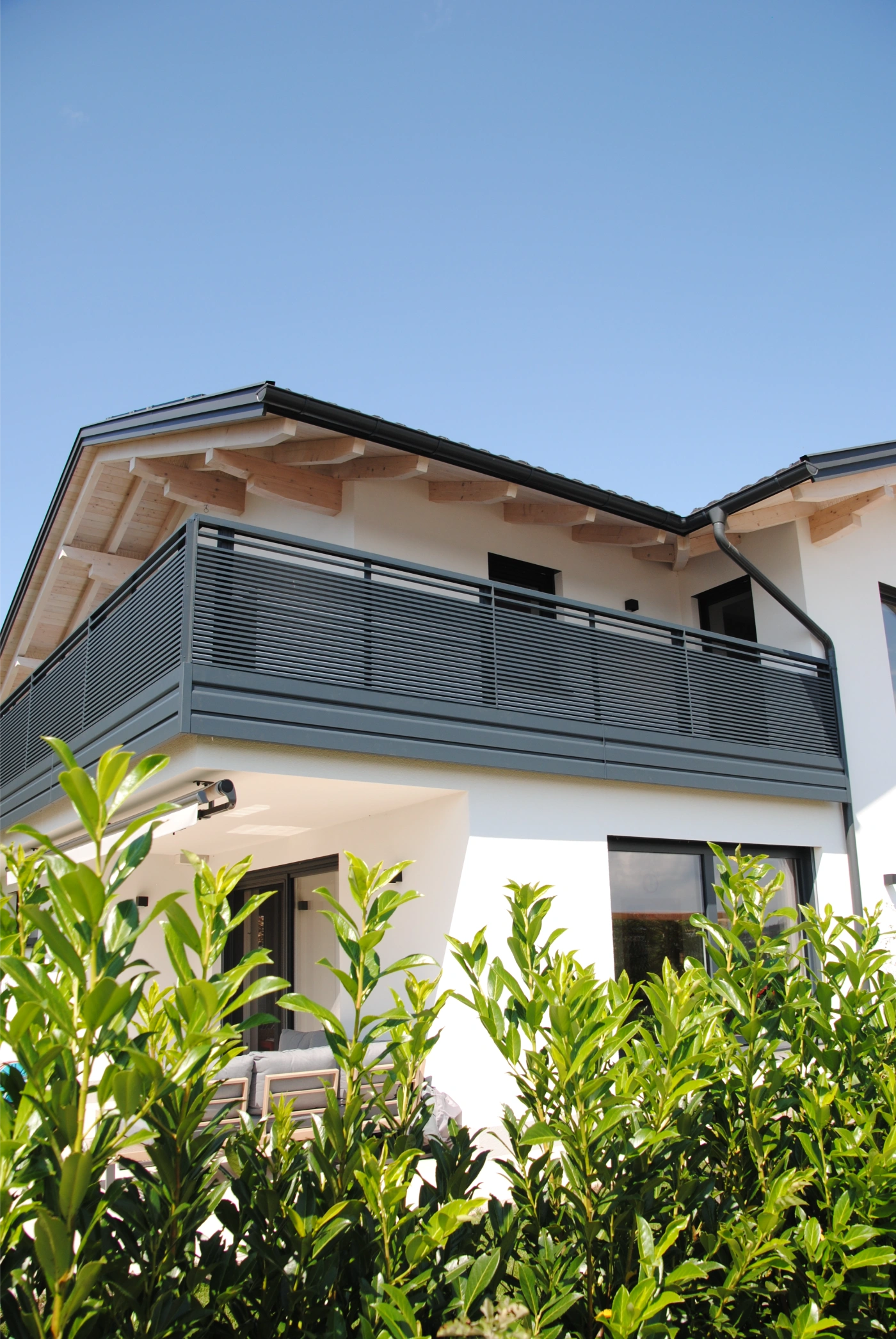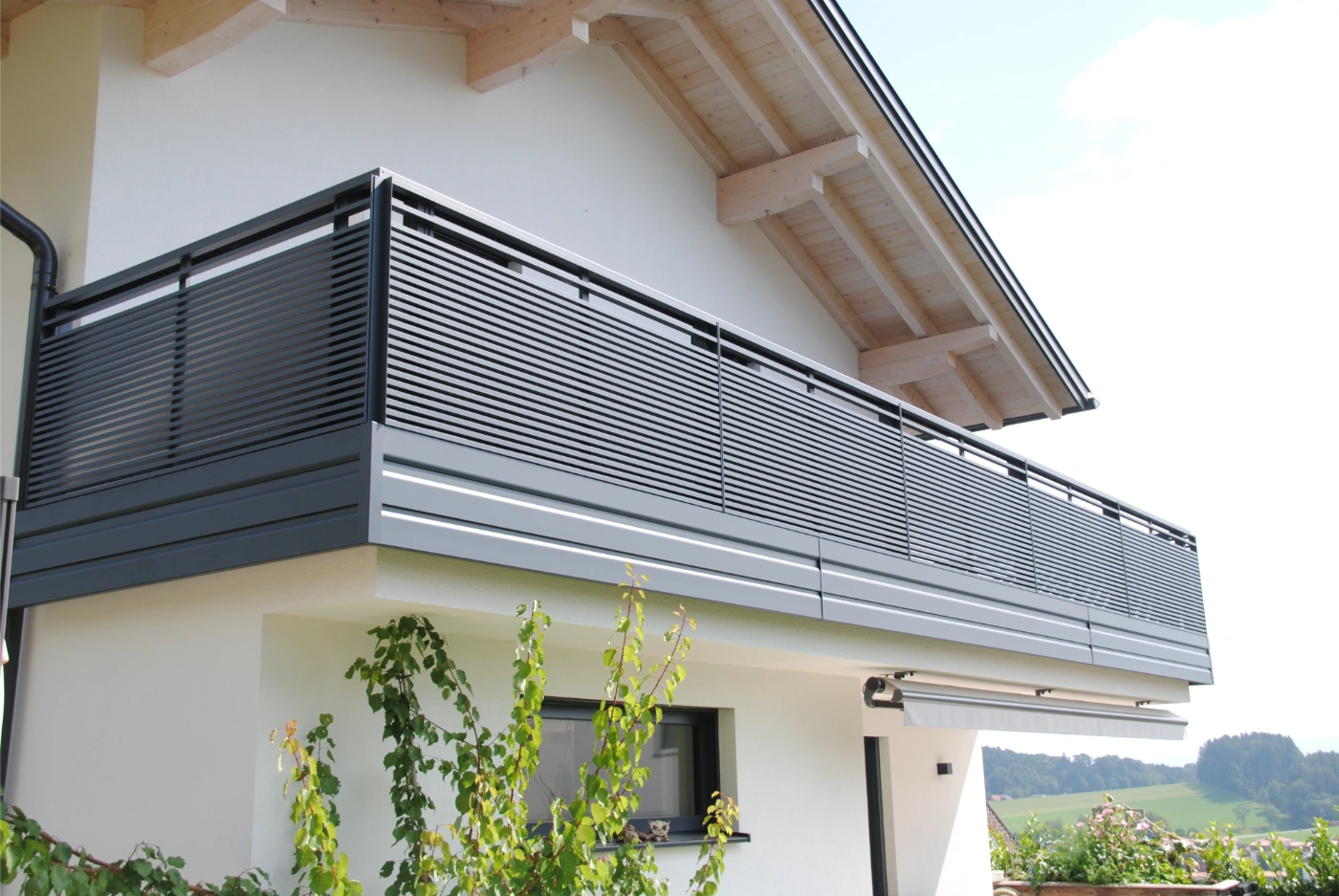 Halbtransparenter Alu Balkon, mit Durchblick von Innen und Sichtschutz von Außen.